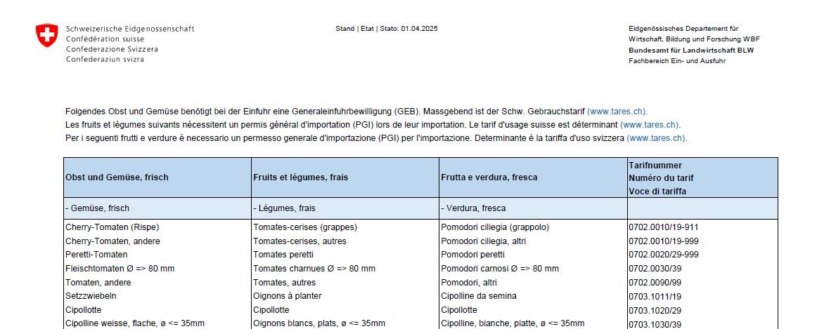 L’Association Suisse du Commerce Fruits, Légumes et Pommes de terre (SWISSCOFEL) publie un guide mis à jour chaque année, dans lequel sont présentées à titre d’aide sous forme de graphiques les périodes administrées pour chaque produit, avec le nom des produits, leur numéro, leur code douanier et les tarifs douaniers. Guide sur la règlementation des importations (swisscofel)