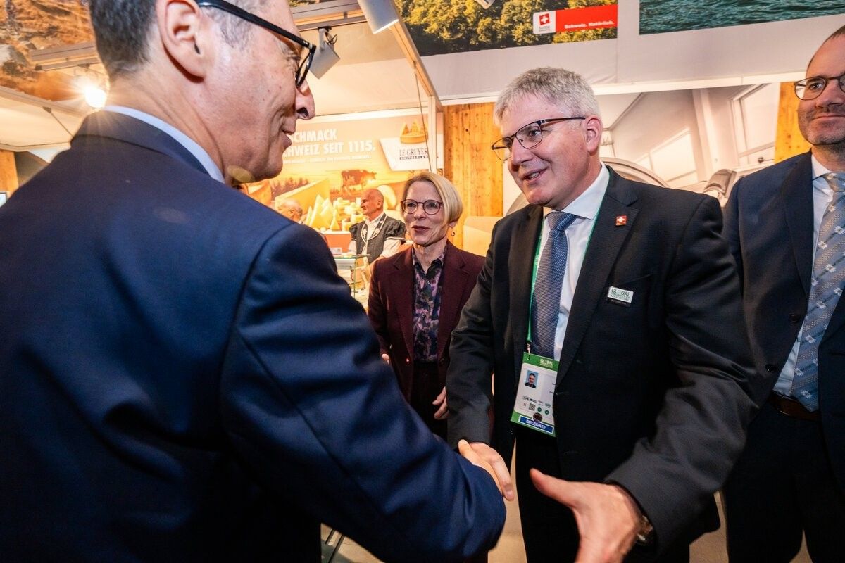 Die Internationale Grüne Woche ist die weltweit grösste Messe für Ernährung, Landwirtschaft und Gartenbau. Sie findet vom 17. bis 26 Januar 2025 in Berlin statt. Parallel zur Messe findet jedes Jahr das Global Forum for Food and Agriculture GFFA statt. Agrarministerinnen und Agrarminister aus der ganzen Welt diskutierten in diesem Jahr darüber, wie eine nachhaltige Bioökonomie die Ernährungssicherheit stärken kann. Die Schweiz war mit Bundesrat Guy Parmelin und BLW-Direktor Christian Hofer an der Agrarministerkonferenz vertreten.