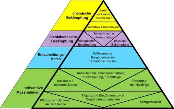 Der nachhaltige Pflanzenschutz beruht auf dem Prinzip des integrierten Pflanzenschutzes. Es gilt der Grundsatz, dass chemische Bekämpfungsmassnahmen nur dann zum Einsatz kommen, wenn mit den verfügbaren präventiven und nicht chemischen Massnahmen kein ausreichender und wirtschaftlich tragbarer Schutz der Kulturen vor Schadorganismen gewährleistet werden kann. Das Prinzip des integrierten Pflanzenschutzes wird in Form einer Pyramide anschaulich dargestellt.