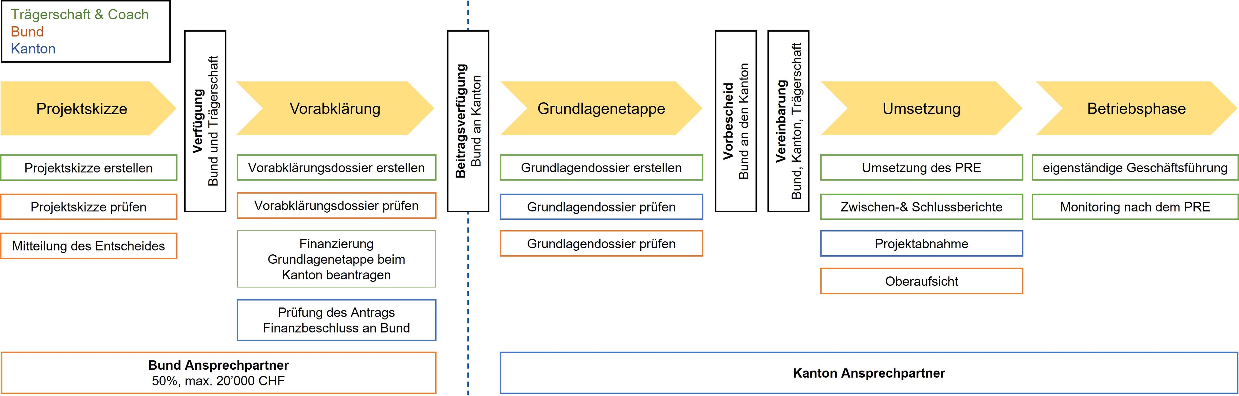 Die Erarbeitung und Umsetzung eines PRE erfolgt in mehreren Phasen. Ausgehend von einer Projektskizze werden die Ziele und Massnahmen des Projekts im Laufe der Vorabklärung (VA) näher beschrieben und in der Grundlagenetappe (GLE) verfeinert (vgl. Abbildung). Für die Erstellung der Planungsdokumente in den einzelnen Phasen stehen auf der BLW-Webseite entsprechende Arbeitsvorlagen zur Verfügung.