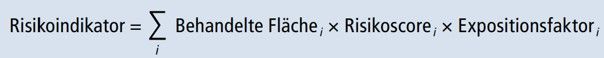 Die Indikatoren basieren auf dem potenziellen Risiko der verschiedenen Wirkstoffe (Risikoscore), der behandelten Fläche für jeden Wirkstoff (berechnet aus den Verkaufsmengen) und den Massnahmen, die zur Risikominderung ergriffen wurden (Expositionsfaktor). Mit diesen Indikatoren kann die Entwicklung des Risikos über die Zeit verfolgt werden.