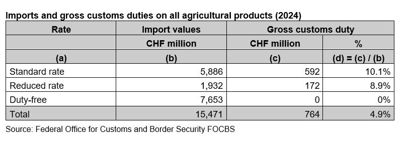 IIn 2024, 49% of Swiss agricultural imports were duty-free, primarily based on preferential tariffs with the EU, zero tariffs with all members of the World Trade Organization (WTO) or customs facilitations for special usages of imported goods. Customs tariff exemptions were also granted under free trade agreements with third countries, for the benefit of developing countries and for processing trade. The weighted average gross customs tariff for all imported agricultural products amounted to 4.9% of the import value. This relatively low average tariff was due to the fact that goods can also be imported at the in-quota tariff, which by definition is lower than the out-of-quota tariff.