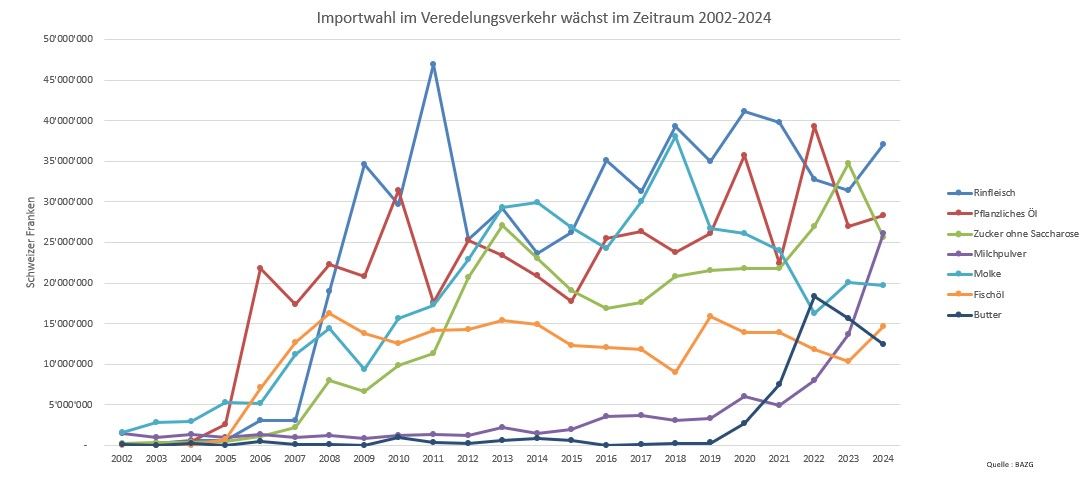 Inward processing involves temporarily importing foreign goods for processing or treatment in Switzerland and subsequently re-exporting them. In 2024, Switzerland imported agricultural products worth CHF 251 million under regular inward processing. This equated to 2% of total Swiss agricultural imports (CHF 15.5 billion), and 60% more than in 2002. The main products were sugar (excluding sucrose), boneless beef for the production of Bündnerfleisch, vegetable fats and oils, whey, butter and other milk fats, and milk powder (imports of which are experiencing strong growth). In the same year, Switzerland re-exported processed agricultural products worth CHF 1.9 billion under inward processing. This equated to 18% of its total agricultural exports (CHF 10.7 billion), and 67% more than in 2002. The main products were soft drinks, infant food preparations, chocolate, cigarettes, other food preparations, filled pasta, odoriferous substances and dried beef. In addition to these figures for inward processing carried out under the regular procedure, there is also a special procedure.
