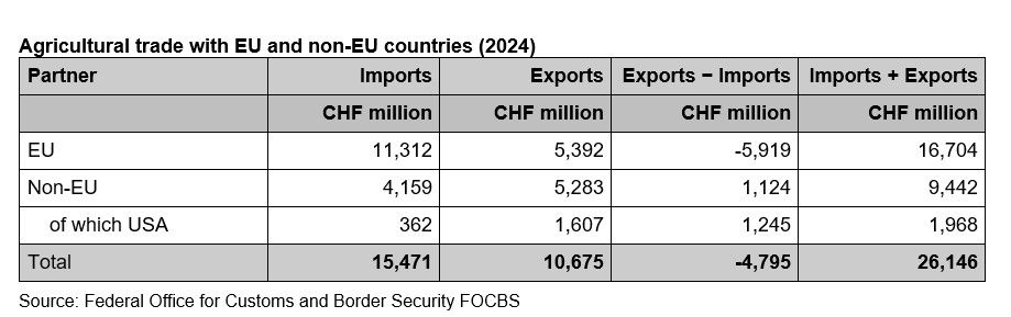 The EU27 is still Switzerland’s main agricultural trading partner. In 2024, 73% of all imports were from the EU, while 51% of all exports were to the EU. Overall trade (imports and exports) with the EU accounted for 64% of Switzerland’s total trade.