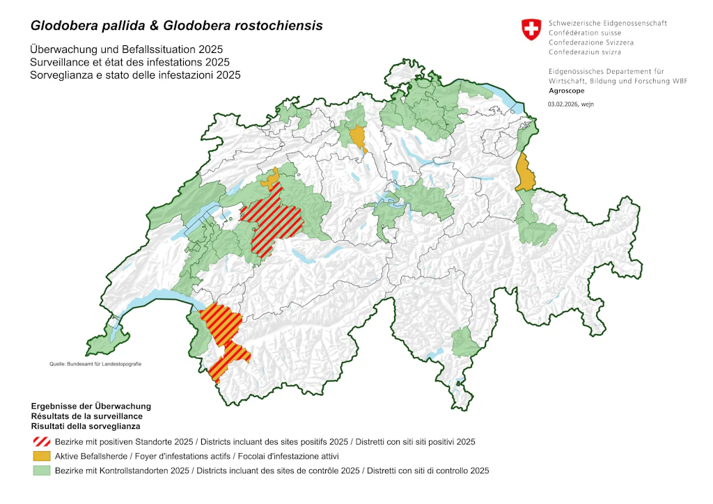 Les nématodes du genre Globodera sont réglementés comme organismes de quarantaine. Ces nématodes peuvent avoir un impact sur les récoltes suisses. Bien qu’ils créent des dommages principalement sur les pommes de terre, ils peuvent être détectés en dehors des champs de pomme de terre, comme dans des serres ou des tunnels (solanacées telles que tomates, aubergines et poivrons principalement).