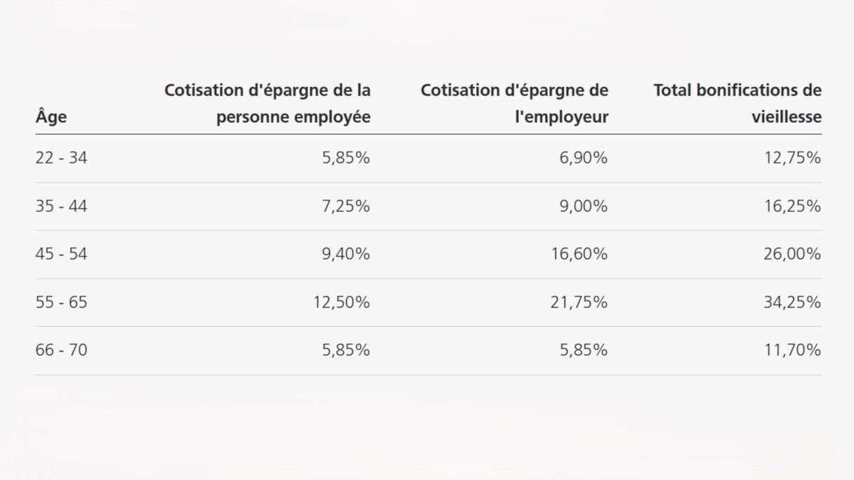Les personnes assurées et l’OFAG cotisent sur le salaire assuré pour financer les prestations en cas de vieillesse, d’invalidité ou de décès. Les cotisations d’épargne varient en fonction du plan de prévoyance et de l’âge.