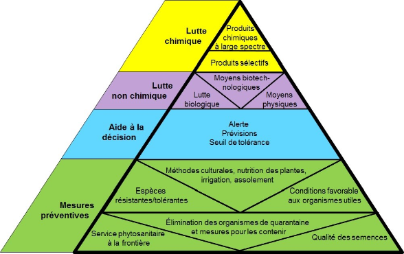 La protection durable des cultures repose sur le principe de la lutte intégrée. Ce principe consiste à ne recourir aux mesures de luttes chimiques que lorsque les mesures préventives et non chimiques disponibles ne permettent pas une protection des cultures contre les organismes nuisibles suffisamment efficaces et supportables au plan économique. Le principe de la protection intégrée des végétaux est représenté sous la forme d’une pyramide.