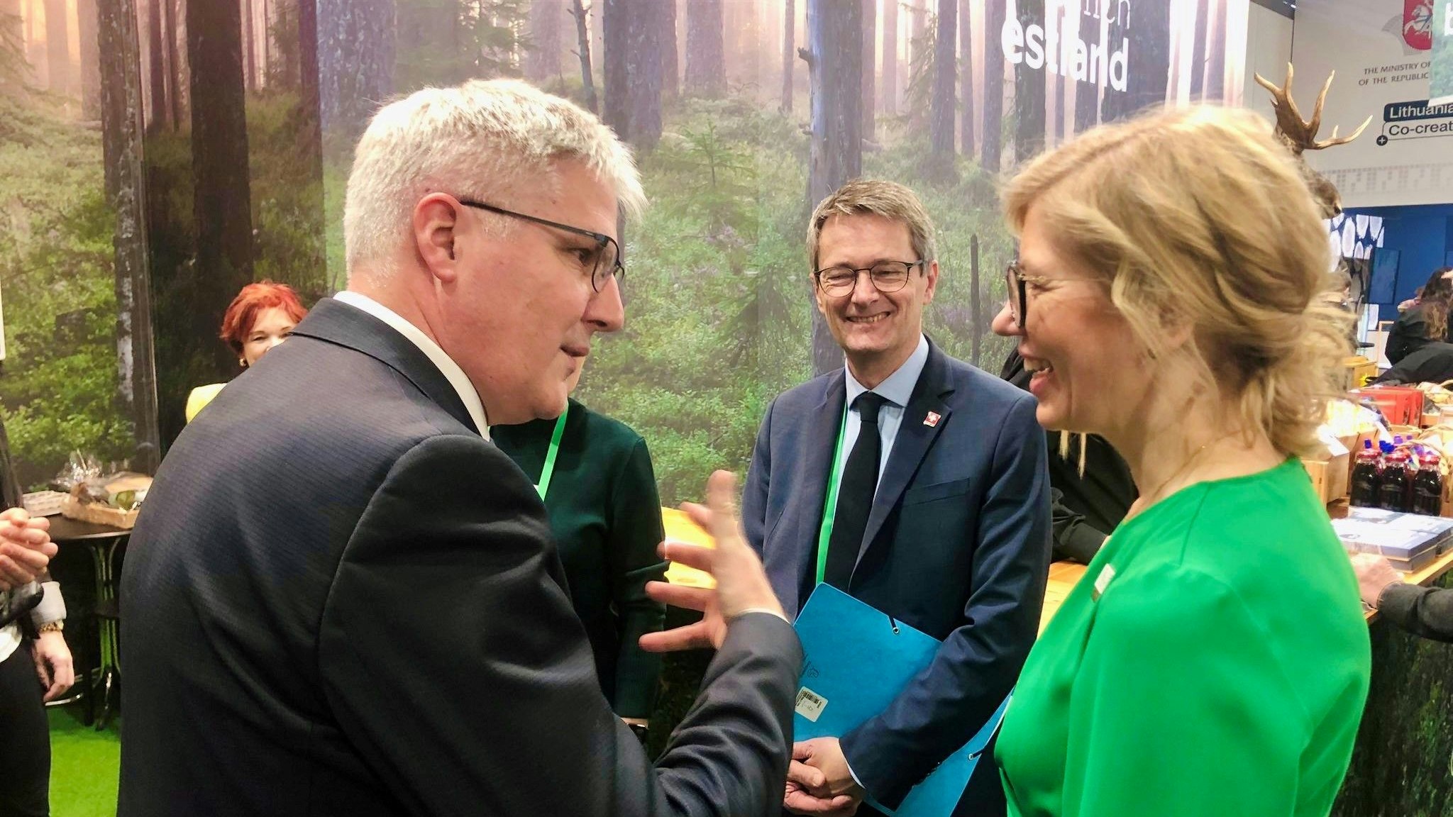 Livia Leu, ambassadrice de la Suisse à Berlin, a accueilli la délégation suisse et des invités venus de Suisse et d’Allemagne. Elle s’est rendue sur le stand de la Suisse à la Semaine verte et a accompagné le conseiller fédéral Guy Parmelin lors de sa visite du salon.