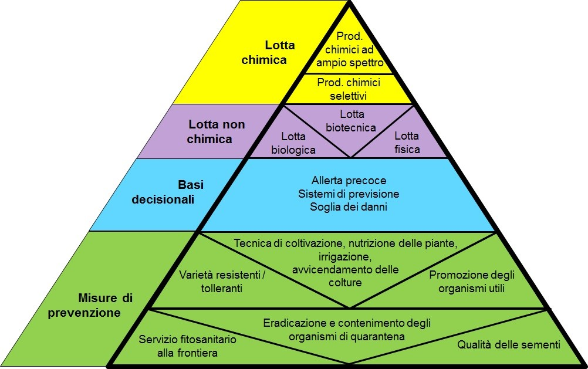 La protezione sostenibile delle colture si basa sul principio della lotta integrata. Questo principio significa che le misure di controllo chimico dovrebbero essere usate solo se le misure preventive e non chimiche disponibili non sono sufficientemente efficaci ed economicamente sostenibili per proteggere le colture dai parassiti. Il principio della difesa fitosanitaria integrata è rappresentato sotto forma di una piramide.