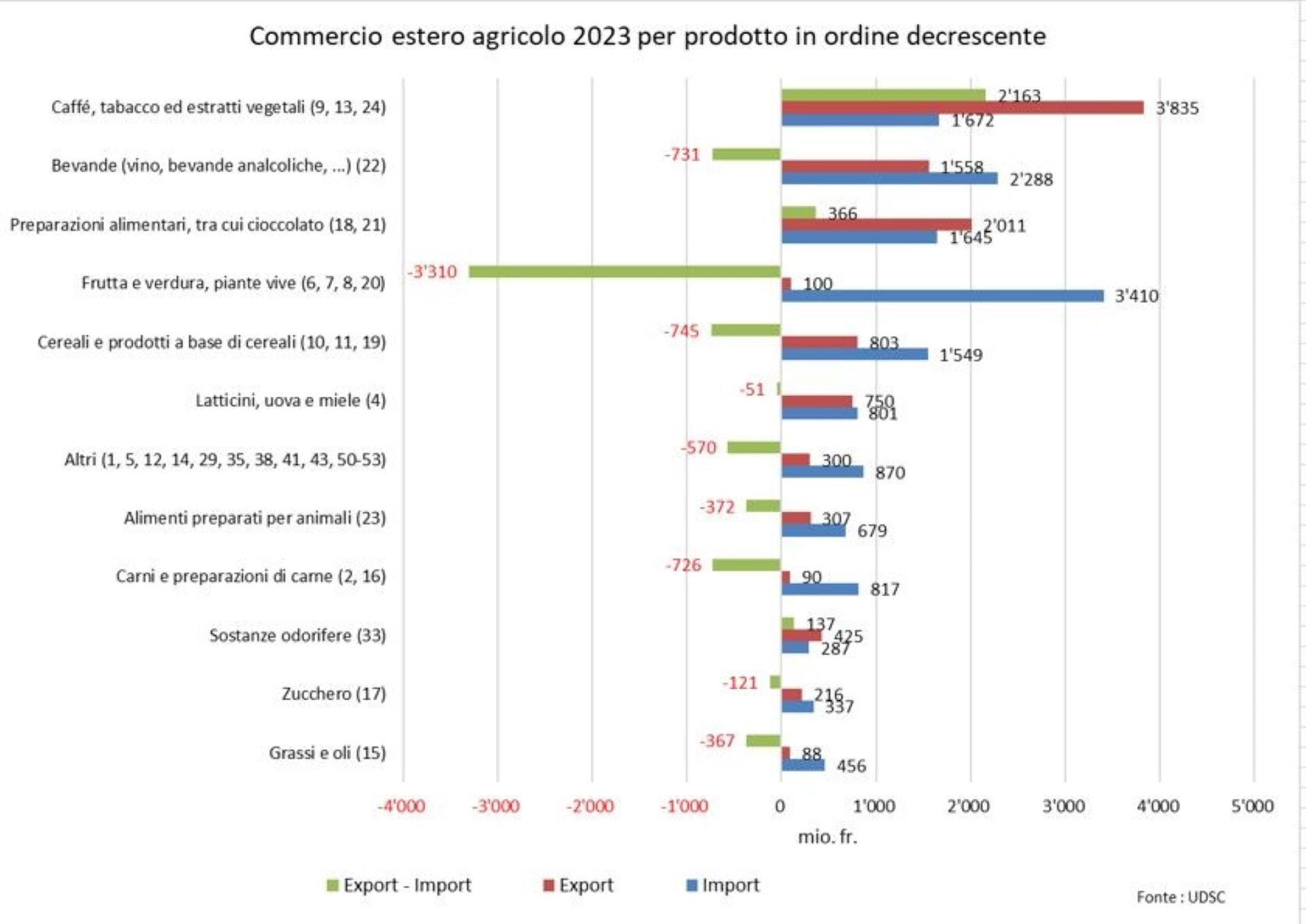La bilancia commerciale, attestatasi a 2.2 miliardi di franchi, è risultata particolarmente positiva per il caffè, il tabacco e gli estratti vegetali (cap. 9, 13, 24). A titolo di confronto le preparazioni alimentari, tra cui il cioccolato (cap. 18, 21), hanno presentato un’eccedenza d’esportazione (366 mio. fr.) sei volte inferiore. La bilancia commerciale è risultata particolarmente negativa per la frutta, la verdura e le piante vive (cap. 6, 7, 8 e 20) (-3,3 mia. fr.), i cereali e i prodotti a base di cereali (cap. 10, 11 e 19), nonché per la carne e le preparazioni di carne (cap. 2, 16) (-726 mio. fr.).